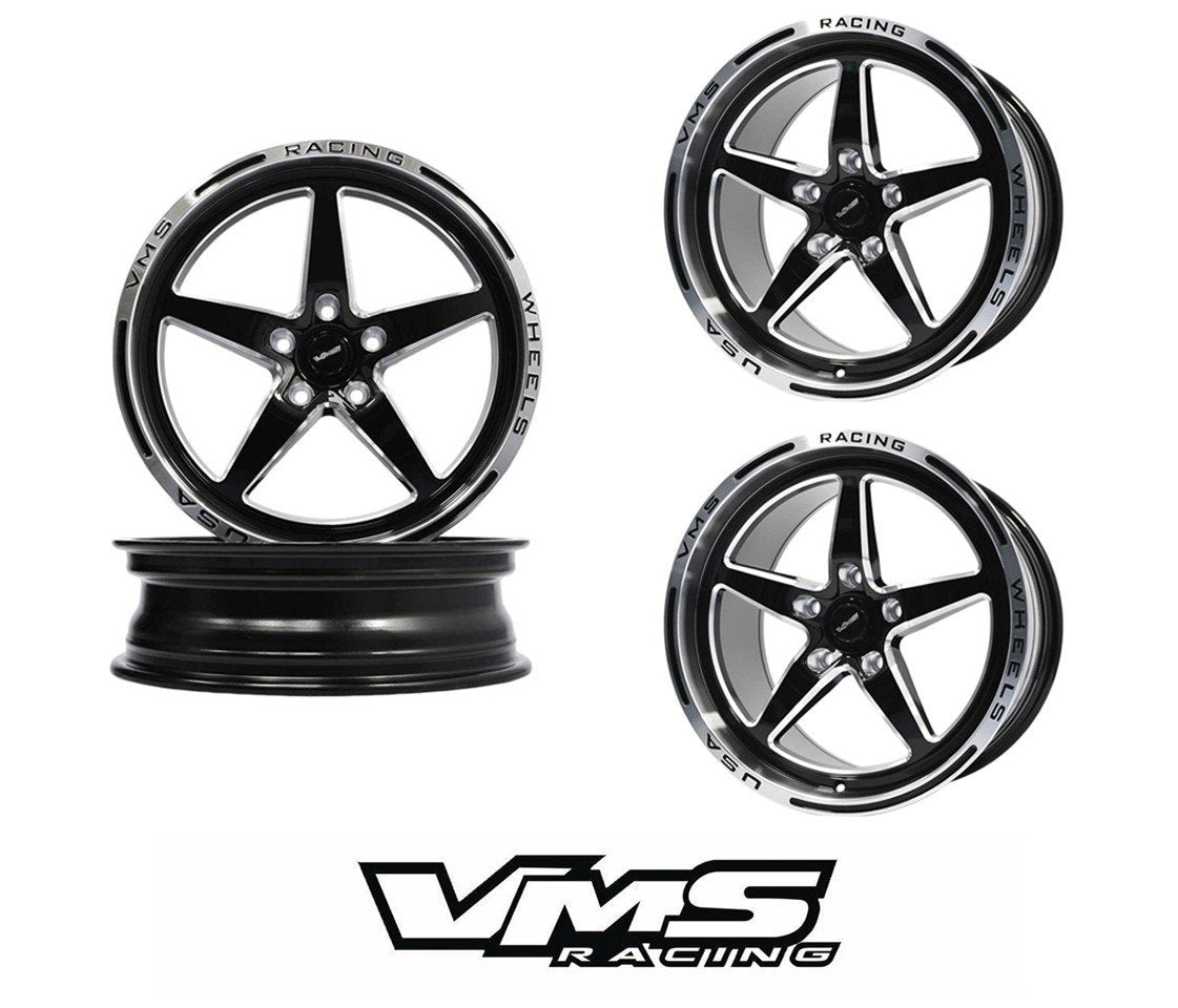 VMS Racing Street/Drag Race Drag Pack wheel set. There are 2 front and 2 rear V-Star 17x10 (30 offset) & 18x5" 5X115 (-30 offset) wheels which are currently available in black milling, all black Dark Series (also milled), and black milling with polished lip.